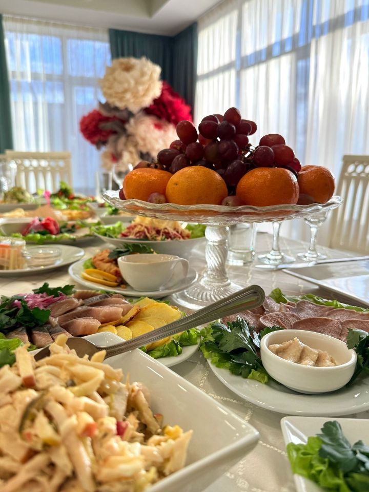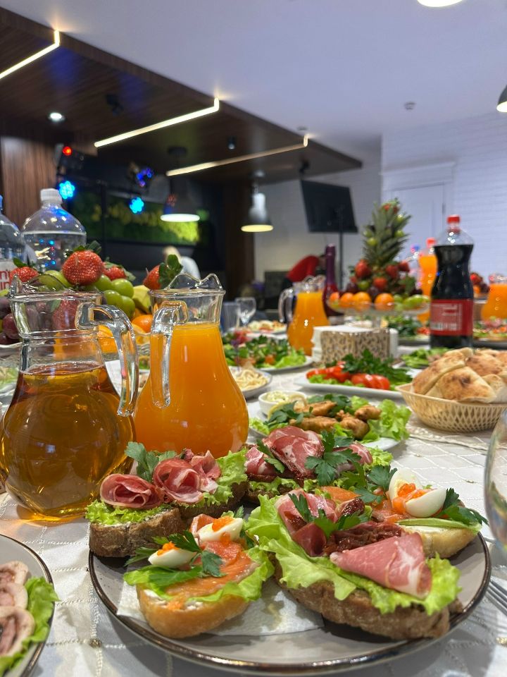 Вкусная еда, собственная кухня. С собой можно напитки, фрукты, сладкий стол.
