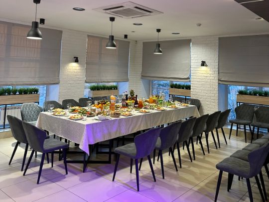 до 60 человек, официант, отдельный с\у, кондиционер, проектор, муз.колонка, место для ди-джея, аренда зала +10% от стоимости банкета
